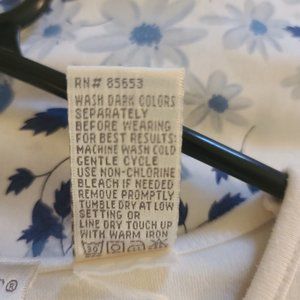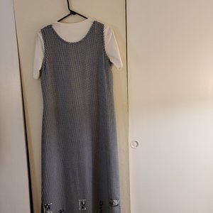 This is a very nice Koret Francisca One Piece Jumper. Ladies size Medium. Fabric is Polyester and Rayon. Gingham blue and white check with embroidered blue flowers on the front of the jumper as well as around the bottom of jumper, with attached /sewn (on the shoulders) white short sleeved shirt. There is a slit on each side of the jumper at the bottom hem. I am sorry that the picture looks distorted but if you zoom in on the pictures it does come in clear. It is midi length. This is a very comfortable jumper and wears and hangs very nice. There are no tears, rips, stains, fading or any alterations. Everything is original. It is to be washed on the gentle cycle, cold water and air dry (see picture). It has been hanging in my closet, covered to keep it clean. I take very good care of my clothes. Any questions please feel free to ask!!