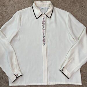 Koret Shirt Womens 10 Ivory Embroidered Floral Button Front Velvet Trim Vintage