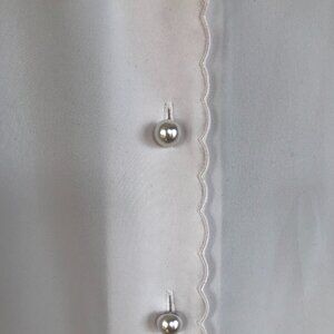 Vintage dressy off-white blouse, women's size 16, with shoulder pads, square cut, scalloped eyelet and embroidery detail on neckline and cuffs, and pearl-like buttons. This soft, pretty cream blouse from the 80s is in excellent condition.