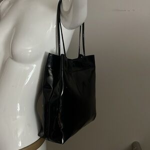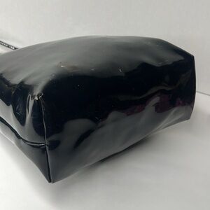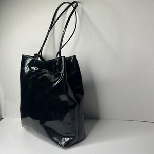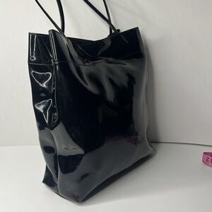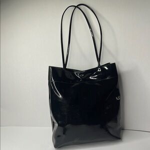 This is a Koret Vintage Black Plastic Shouldet Tote Bag Intetior Snap Closure. Does show some wear of corners and on the outer. Scuffs scratches and slight discoloration. No odors. Bag is 10” x 8.5” x 3.25” with 8” double handles