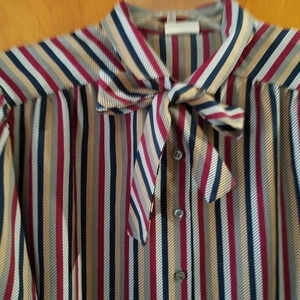 Vintage Koret Burgundy Navy Gray Striped Exaggerated Sleeve Blouse Bow Tie