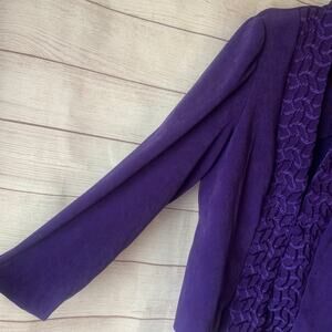 Vintage purple blazer jacket by Koret Stretch Dress. This long sleeved blazer jacket has a single button and loop front closure. The button is square! There is a band of embroidered detail that lines both sides of the front opening and a thin band that wraps around the back of the collar. It has attached shoulder pads. It is made of a velvety-feeling material. It is pre-owned but in great condition.