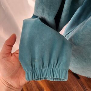 Koret Floral Embroidered Jacket. Soft faux suede material. Teal blue/green color with multicolor Embroidered flowers. Shoulder pads. Pockets. Full zip.
