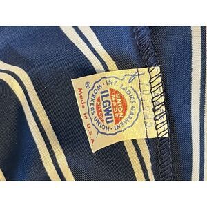 This vintage Koret blouse features a blue and white striped pattern with a button and sash tie neckline. The long sleeves have slight balloon detailing and the blouse has a classic fit for a flattering look. Made of machine washable polyester, this blouse is easy to care for. The large ascot bow neck adds a touch of geeky, librarian chic to any outfit.