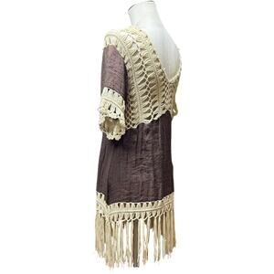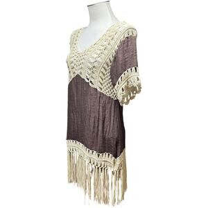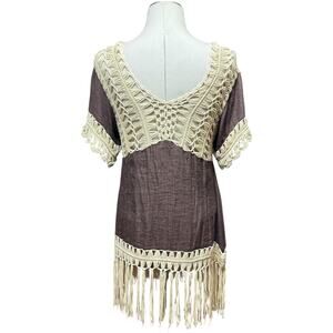 Tags: Lightweight Flowy Fringe Tassel Macrame 60s 70s Hippie Boho Bohemian Festival Crochet Knit Tunic Western Brown Tan Beige Neutral