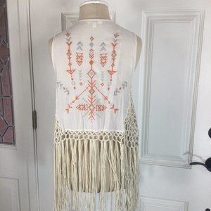 Kori America Crochet Boho Fringed Vest Womens Small Rust Beige Aztec Embroidery