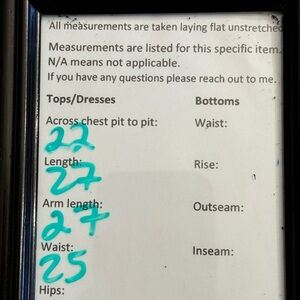 Pit to pit: 22", length 27”, arm length 27", waist 25"