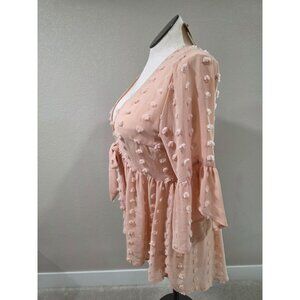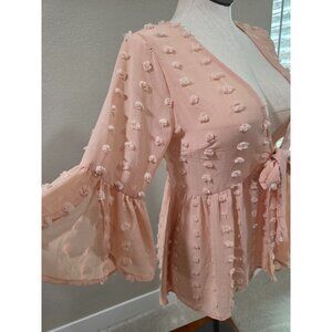 Kori America Pink Swiss Dot Textured Tie-Front Flowy Bell Sleeve Peplum Blouse T