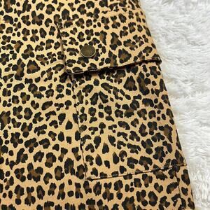 Cheetah print boutique skirt with flap and snap side pockets, slash pockets at hips, and raw hem. Has a bit of stretch.