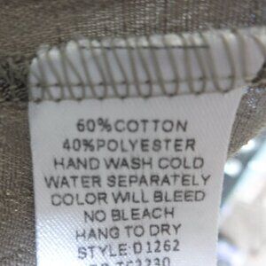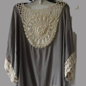 large cream crocheted design on back, fringe on sleeves, hem, cotton/poly ,approx. 40" long