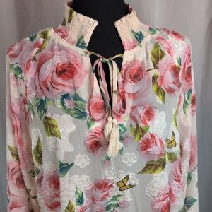 Embrace elegance with this Kori blouse, featuring a relaxed fit and a chic tie front. The mandarin collar and long sleeves add a touch of sophistication, while the pink and cream hues offer a soft, romantic appeal.