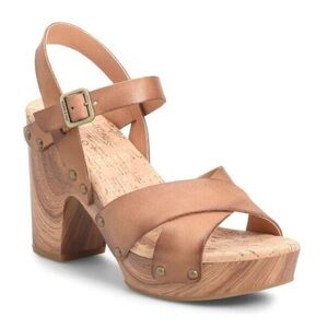 These open toe Drew leather platform sandals from Kork-Ease in brown feature cross crossing leather straps across the vamp, an adjustable sling back ankle strap with logo buckle, a chunky block heel and platform, cushioned cork footbead, and nail head studded detailing at the mid sole.