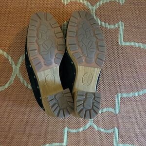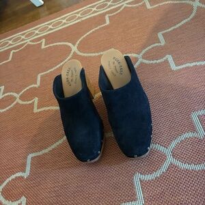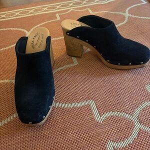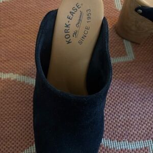 Kork Ease Black Suede Clog/Mule, size 9.5. Studded. Heel height with platform is roughly 4-5" without platform, 3-4". Padded footbed. Very comfortable.