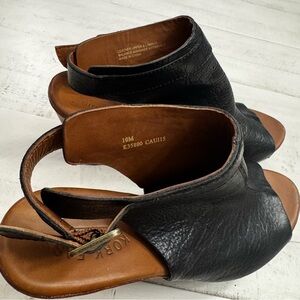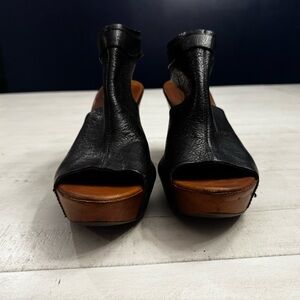 Chic black leather upper with tan wedge. Adjustable buckle strap. Ideal for versatile styling.