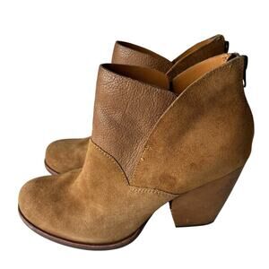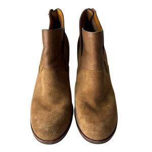 Korkease Castaneda Suede Bootie in Rust. Size 7.5. Features round toe, block heel, petal-shaped shaft, mixed-media leather upper, cushioned leather footbed, and back zipper closure. Style K42626. Excellent pre-owned condition.