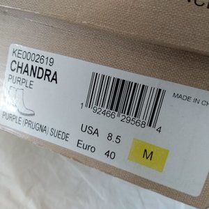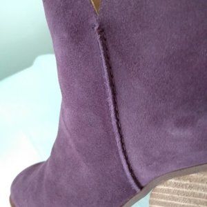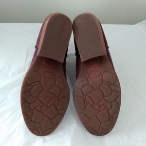 Women's US 8.5 medium. Beautiful for fall! Very good worn condition, light signs of wear on soles and footbed. Purple suede upper, leather lined, high-traction flexible lightweight rubber outsole, 2.75" stacked heel, back zip. Small flaw on the back of one heel, condition issues reflected in price. Ships with box.