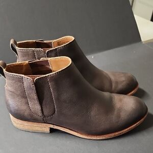Chic dark brown leather booties. Sleek design with a comfortable fit. Ideal for versatile styling.