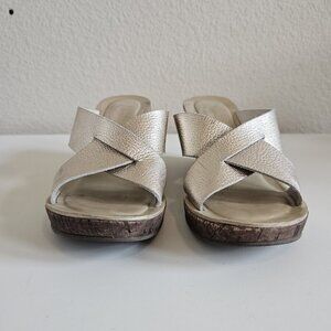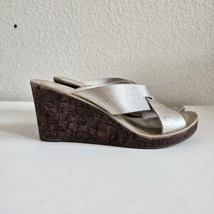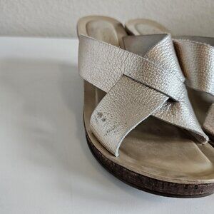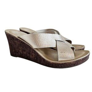 Kork-Ease Geena Metallic Gold Pebbled Leather Cross Over Strappy Wedge Sandals 9
