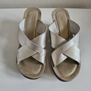 Kork-Ease Geena Metallic Gold Pebbled Leather Cross Over Strappy Wedge Sandals 9