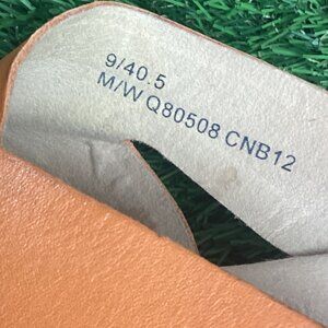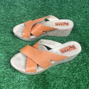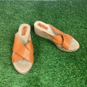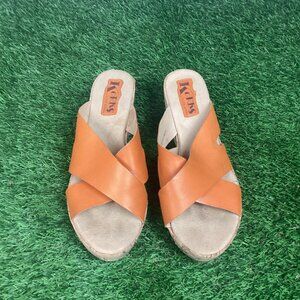 Orange leather cross over strap sandals with a cork wedge. Good used condition. Slip on style.