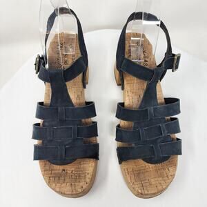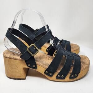 Kork-Ease Talia Sandal Women 9M Black Leather Strappy Studded Platform Chunky Wood Look Sole Adjustable Buckle Ankle Strap Brass Tone Hardware