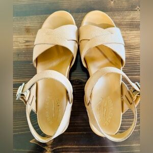 Elevate your look with these stylish tan platform sandals. Designed for comfort and flair. Pre-loved but in great shape. Size 8.