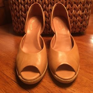 Classy slip on wedge sandal with soft leather upper and leather wrapped heel. The style elongates legs.