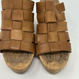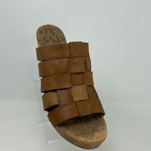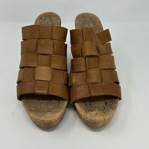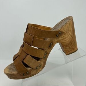 Keywords: Kork-Ease sandals, women's brown sandals, leather sandals, block heel sandals, slip-on sandals, summer footwear, casual sandals, high heel sandals, woodgrain heel, antiqued rivet sandals, leather upper sandals, women's size 11 sandals, pre-owned sandals, stylish summer shoes, comfortable leather sandals