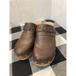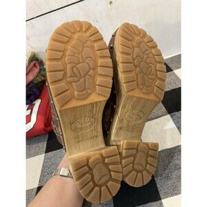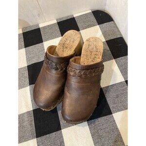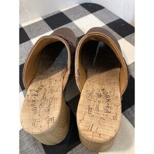 The Kork-Ease Woven Studded Leather Cork Sole Wood Platform Clogs are stylish and comfortable shoes for women in size 6. With a brown leather upper, woven fabric lining, and studded accents, these clogs feature a cork insole and outsole for added comfort and support. The unique combination of leather, cork, and wood make these clogs a trendy and versatile option for casual wear.