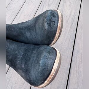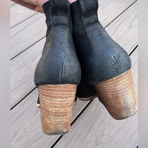 Kork-Ease black suede leather round toe chunky heel wedge boots. Leather suede upper. Minor wear noted. Still look great. Fun , funky style. Women’s size 7.5