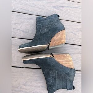 Kork-Ease black suede leather round toe chunky heel wedge boots. Leather suede upper. Minor wear noted. Still look great. Fun , funky style. Women’s size 7.5 Tags- Kork ease, suede, leather, wedge, heeled boots, funky, street wear