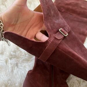 A distressed finish and adjustable shaft buckle lend modern elements to a supple suede boot grounded by a cushioned footbed and low stacked heel.