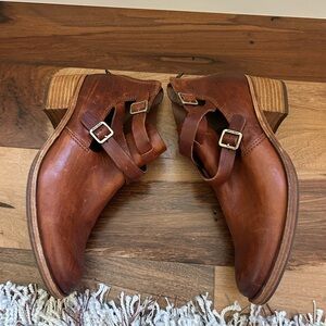 Like new pair of Kork-ease brand brown leather booties in a size 8.5. These boots have straps that go around the top of the foot and ankle area with a zipper closure at the back of the heel. No stains or flaws!