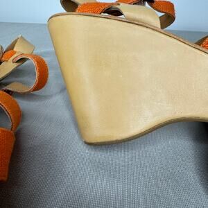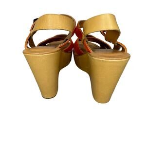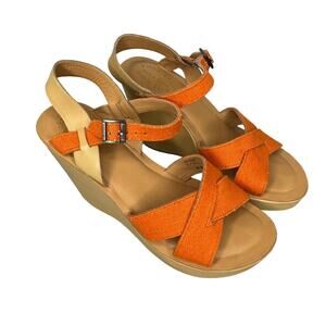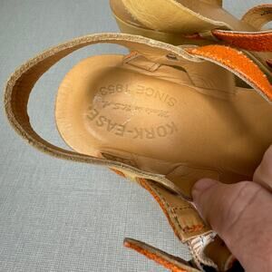 Kork-ease wedge strap sandals. Leather and fabric straps, buckle at ankle. Smooth wedge. Great Condition