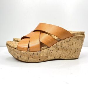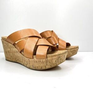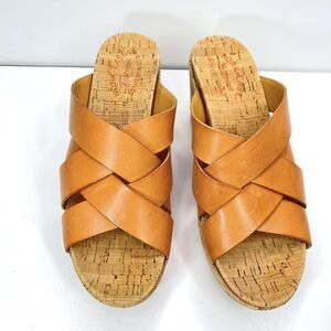 Korks Cork Wedge Slides Sz 9 Brown Leather Open Toe Strappy Boho Platform Sandal