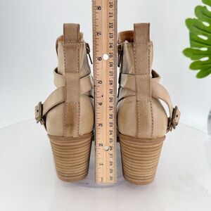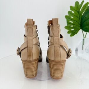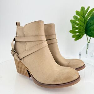 -Korks Heidi Block Heel Bootie Ankle Boots Beige Tan Buckled Almond Toe Size 6.5M