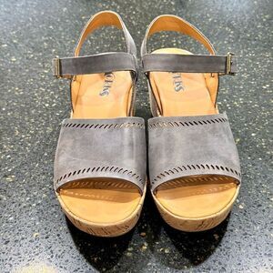 Excellent condition Korks Kork Ease Tone Quarter Strap Gray Leather Cork Wedge Sandals. Size 7M. Leather uppers are in great shape. Tread is full. Cork wedge is perfect. Footbed is very nice and padded. From smoke free pet free home.