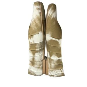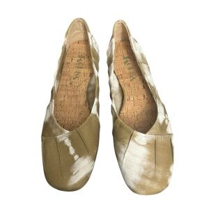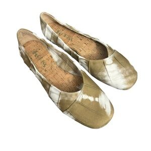 Korks Palmer Baler Flat. Tie dyed upper with unique ruching detail. Cushioned footbed. Flexible outsole.
