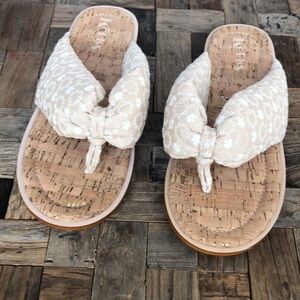 Korks Poppy Cream Embroidered Fabric Thong Sandal. Floral embroidery, tan with cream. These look new with no signs of use. Size 10M