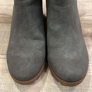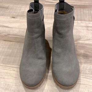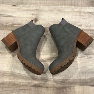 A faux leather bootie with a lug sole and dual gore insets offer a versatile, refined style for any outfit. 2" heel Round toe Pull-on style. Worn once. In like new condition.