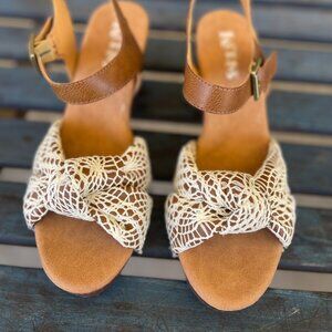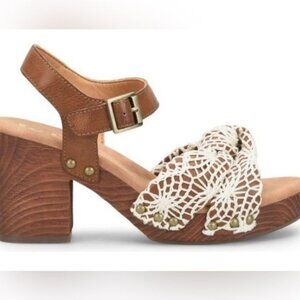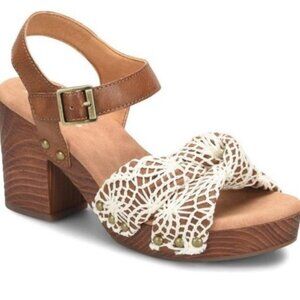 Korks-Ease Natalia Women’s Sandals 10 Brown Leather White Crochet Wooden Block H