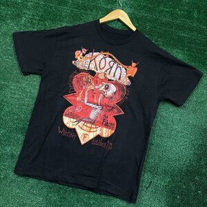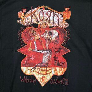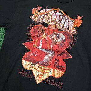 Korn Self- Incineration Rock T-shirt size large It roughly measures 22 inches pit to pit 28 inches long. Great shirt for your closet.