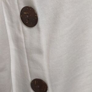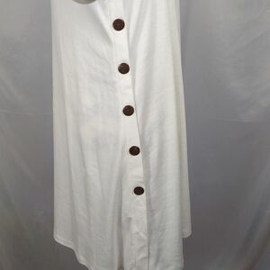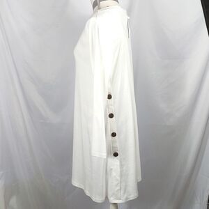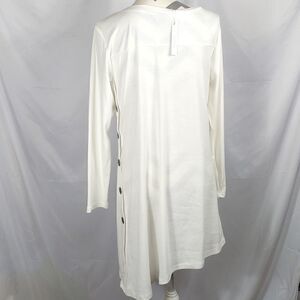 This New with tags white long sleeve asymmetrical Korsis knit dress is a size Large with the pit to pit measuring 22". It has five big decorative buttons on left side. 35% cotton 60% polyester 5% spandex and machine washable. All offers welcome.