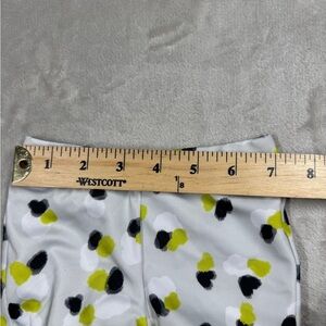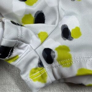Light grey with abstract polka dot design in chartreuse, black, and white. Stretchy. Swim, beach, pool, outdoors, water, vacation