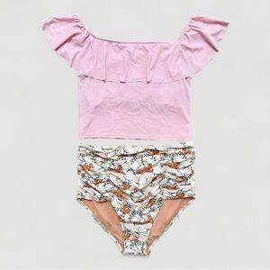 • Adult maternity off-the-shoulder “ruffled around”top (light pink ribbed) + tiger floral ruched bottoms (size L, maternity)