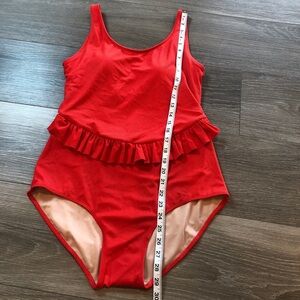 Womens one piece swimsuit, true to size, nwt, fully lined, front shelf bra sewn into side seams (elastic under the bust for support and comfort) removable bra pads, thick shoulder straps for added support. Round neckline, scooped back, dainty ruffle around waistline. Please note that clothing colors may appear different on screen. Retails for $85. Comes from a smoke free home and pet friendly home. Measurements flat with garment un-stretched. Please ask any questions that you may have.
