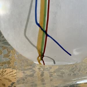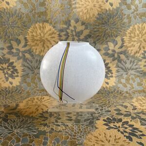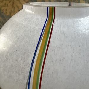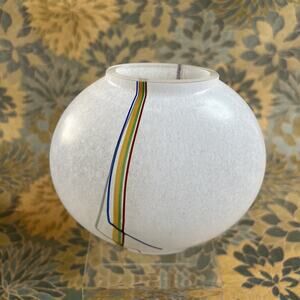 Product Features:• Artist: Bertil Vallien• Brand: Kosta Boda• Model: 48224• Design: White glass with rainbow vertical stripes• Height: 5 5/8 inches• Material: Hand-blown art glass• Origin: Sweden• Era: 1980s• Signature: Signed by Bertil Vallien• Condition: Excellent vintage condition