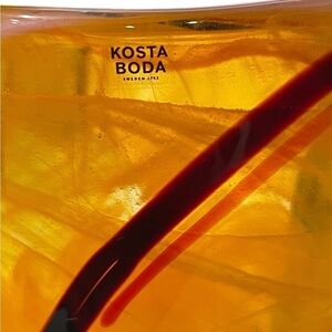 Kosta Boda Orange Swirl contrast abstract Art Glass vase Anna Ehrner Sweden. This vase is 8 inches tall and beautiful. It has a Kosta Boda sticker on it. In one side of the vase it is engraved “ congratulations on your 25 th anniversary. The orange swirl and other colors combined are so beautiful. This is a modernistic vase made in Sweden. The vase is in perfect condition. 8 X 6 inches in dimension.