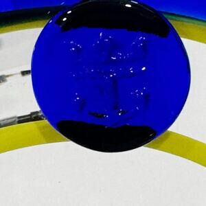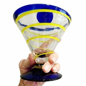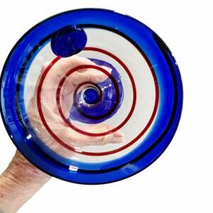 Excellent preowned condition with no chips or cracks. These beautiful glasses are hand blown for.Royal Caribbean Cruise Lines by glass experts at Kosta Boda. One glass is navy blue with yellow swirls, and the other glass has red swirls. Both glasses have the stamped royal Caribbean logo inside of each. Sturdy glasses that are heavy to the touch and just gorgeous. Each class is approximately 4 1/2 inches tall and four 4 3/4 inches in diameter at the top, 3 3/4 inches diameter at the base. What a great look for any liquor cabinet or to put out with flowers!