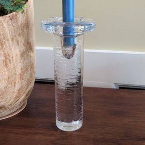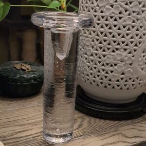 Kosta Boda Textured Crystal Glass Candleholder Modern Swedish Design. This heavy candleholder features random inner bubbles, exterior spiraling line design, and a thick top lip that can fit a small pillar candle or a taper candle.